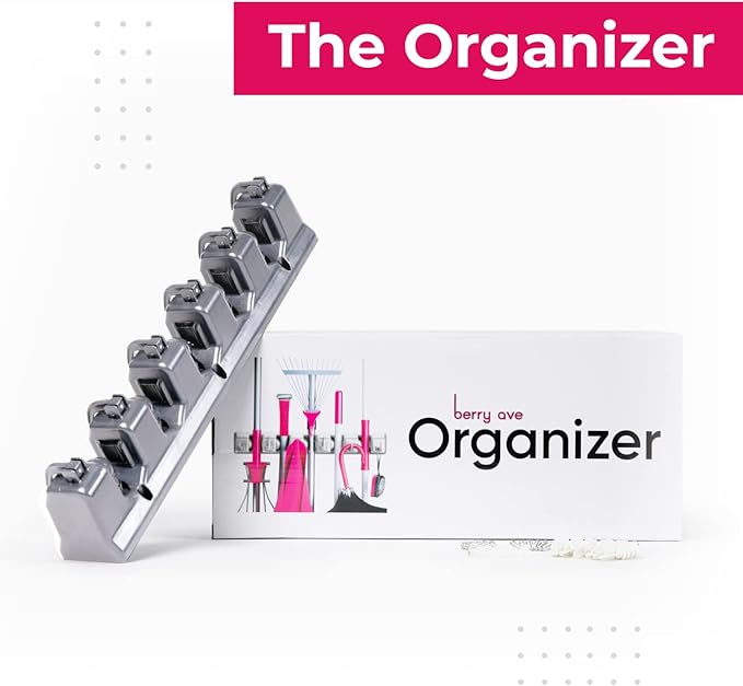 Berry Ave Broom Holder Wall Mount and Garden Tool Organizer, Closet Storage, Kitchen Rack, Home Organization and Garage Organizer for Rake or Mop Handles Up to 1.25-Inches, Hanger Plus 6 Hooks (Grey)