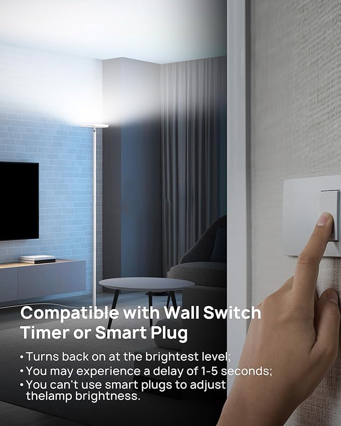 - Compatible with Wall Switch: The sliver floor lamp is perhaps the first lamp which doesn’t use the mechanical switch, but can be turned on/off by using your wall switch or smart plug. However, you may experience a delay of 1-5 seconds before the light could be turned back on, due to different wiring design of your wall switches. The modern floor lamp will be turned back at its previous brightest level