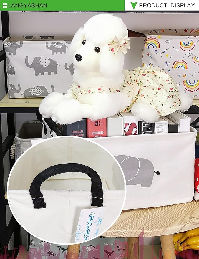 LANGYASHAN Rectangular Storage Bin Collapse Canvas Fabric Cartoon Storage Basket with Handles for Organizing Home Kitchen Boys and Girls Toys Office Closet Shelf Baskets (REC Elephant)