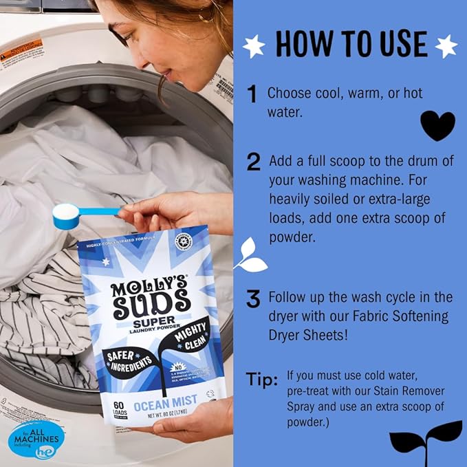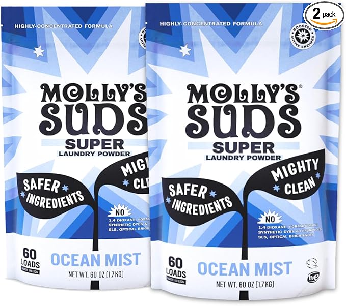 - WHAT'S INCLUDED: (2) 60 Count Packs of Molly's Suds Ocean Mist Super Powder (120 Loads Total)