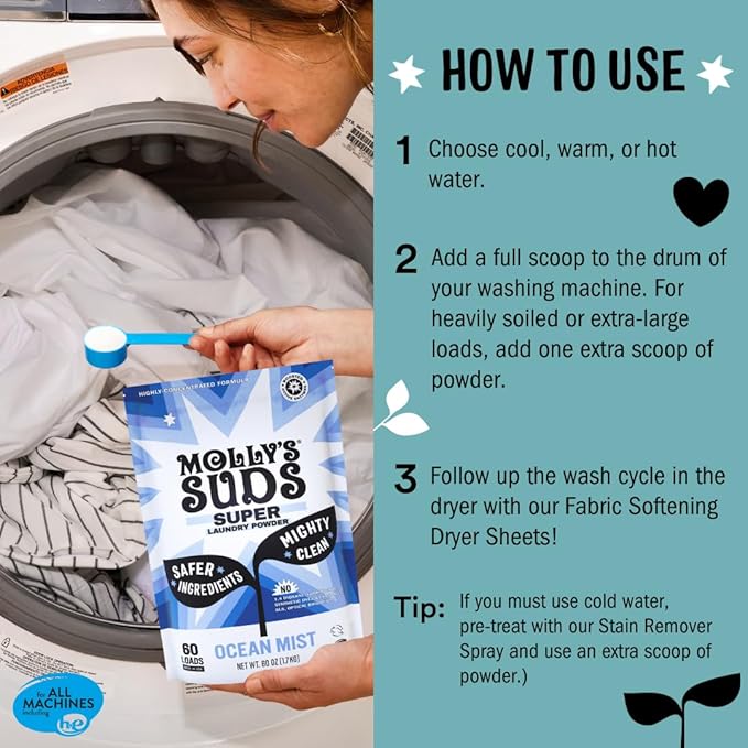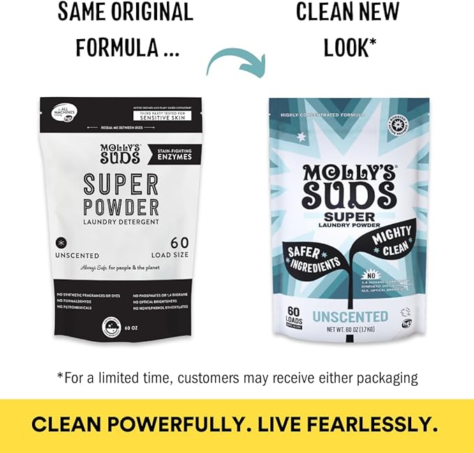 - WHAT'S INCLUDED: (2) 60 Count Packs of Molly's Suds Unscented Super Powder (120 Loads Total)