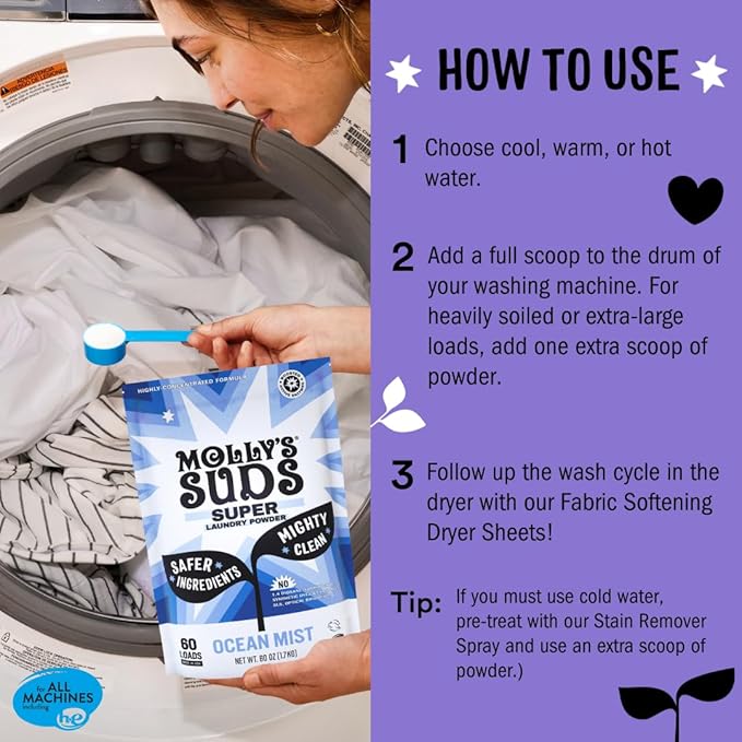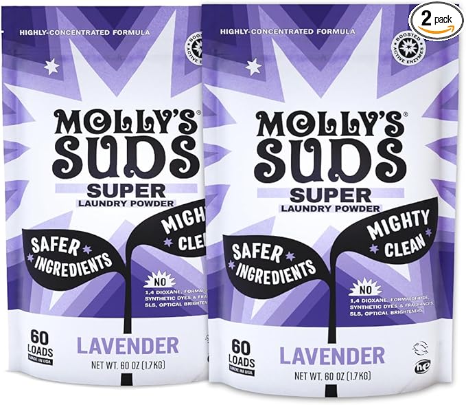 - WHAT'S INCLUDED: (2) 60 Count Packs of Molly's Suds Lavender Super Powder (120 Loads Total)