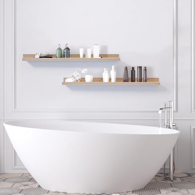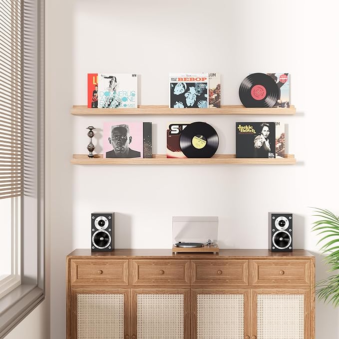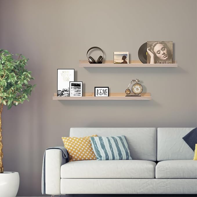 - Photo ledge shelf dimensions: 36" x 4.5" x 1.8" inch, a set of 2 natural wood picture ledges,It can both decorate the room and increase storage space.