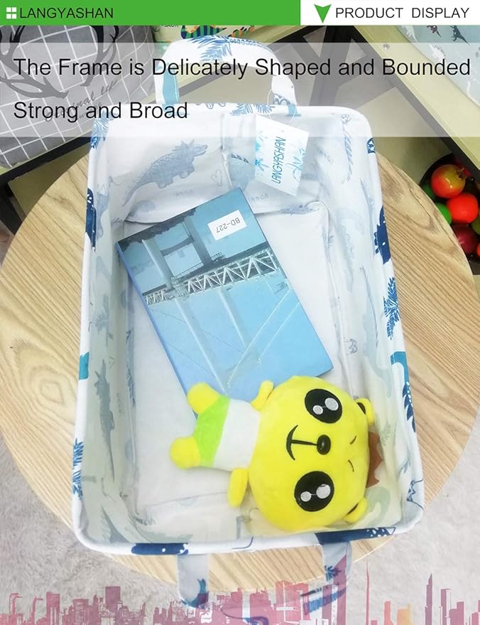 LANGYASHAN Rectangular Storage Bin Collapse Canvas Fabric Cartoon Storage Basket with Handles for Organizing Home Kitchen Boys and Girls Toys Office Closet Shelf Baskets (Rec green dinosaur)