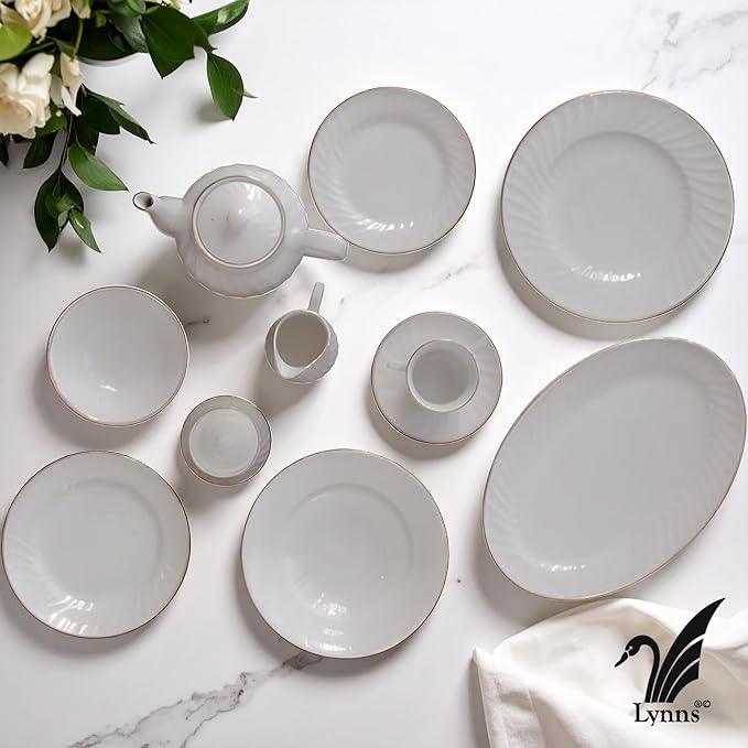 - White porcelain body. Each piece is shaped with a rippled swirl shape.