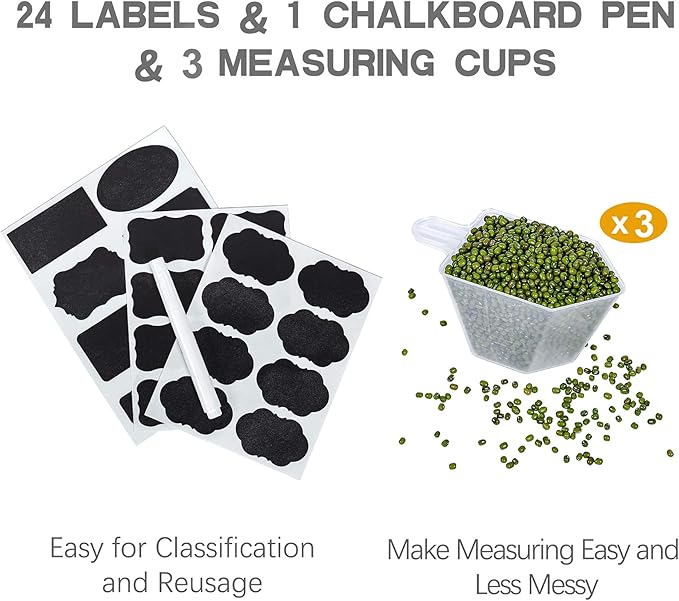 - 24 Reusable Labels and 3 Measuring Cups ---- Cups make measure out ingredients easier and less messy. The Reusable labels can reduce your confusion about those similar items. Dishwasher safe for the container, please hand wash the lid.