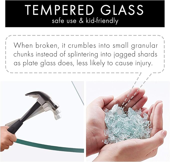 - Tempered Glass: 7mm extra thick tempered glass, safe use. When broken, it will crumble into small granular chunks instead of splintering into the jagged shards as plate glass, unlikely to cause the injury. We tested our glass shelves to ensure that two brackets of each shelf can safely hold tempered glass, with a maximum weight of 11 lb.