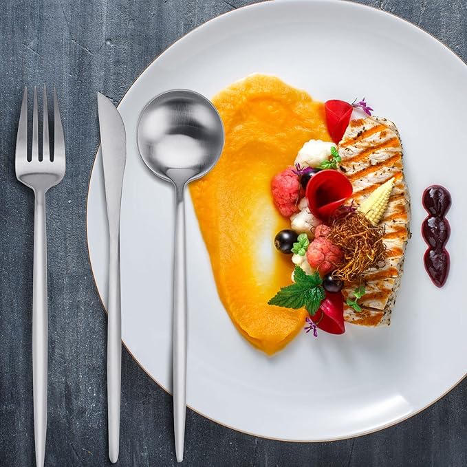 - ★ Modern silverware set--This eating utensils sets have the slim profiles and pointed stems, is a sophisticated take on minimalist design. The silver kitchen utensils set includes everything you need for a formal full-course meal. They can match your modern dinnerware set and dish set perfectly.