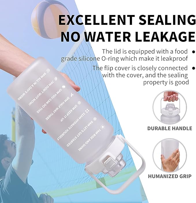 - đȘăMotivational Quote & Time MarkerăThe 64 oz - 2 liter large fitness water bottle jug with straw is with time markers and unique motivational measurement statements on it, the half gallon water bottle with tracker is the best choice of reminding you to stay motivated to drink enough water daily. It is important and easy for achieving healthy fitness goals including weight loss, muscle gain, keep hydrated and healthy with the motivational water bottle.