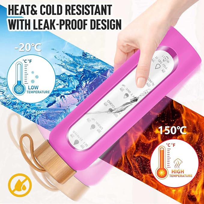 - Your Ultimate Hydration Partner: Our clear glass drinking bottle are made of borosilicate glass, which is dishwasher safe, leak proof, BPA, BPS, PVC, lead, and cadmium free. These durable and aesthetic reusable glass time water bottles will not crack under extreme temperature and pressure