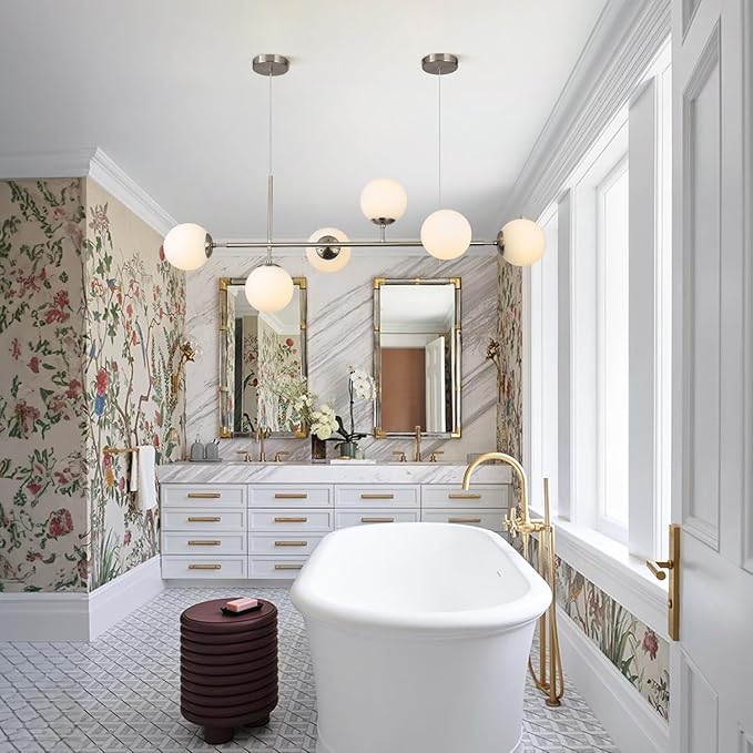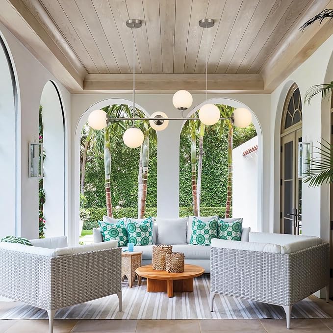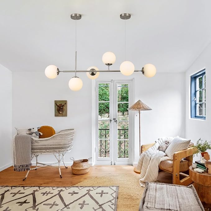 - Unique Design: The brushed nickel linear chandelier for kitchen island composed of 6 spherical white glass lampshades and silver iron rods. Irregular arrangement of 6 Globe Glass Shade, the whole light fixture is exquisite, practical and beautiful, and the white glass curtain makes the light emit a pleasant light