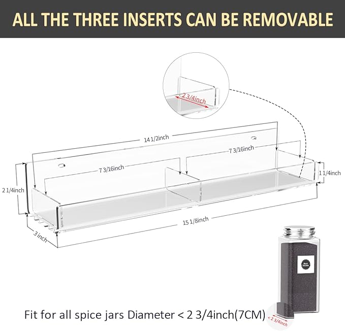 - TWO WAYS TO USE : This acrylic spice rack is different from others. We offer 3 removable barriers for one shelf. There is an extra one in the middle. So it can be a spice divider on the shelf. You can also choose not to insert the middle one if you don't like it. Divide it to two part or not, it's all up to youself.