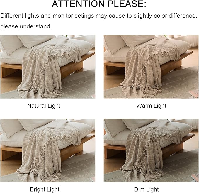 - 【FANTASTICAL DESGIN】LIFEIN throw blanket for couch nicely neutral solid knit design and well-arranged rustic farmhouse style fringes, this knitted throw blanket is in kinda beige/light tan/light taupe, which is a pretty easy way to match your room to add an extra solid neutral beige/tan boho feature, don't you want have a beige throw blanket for your home decor?