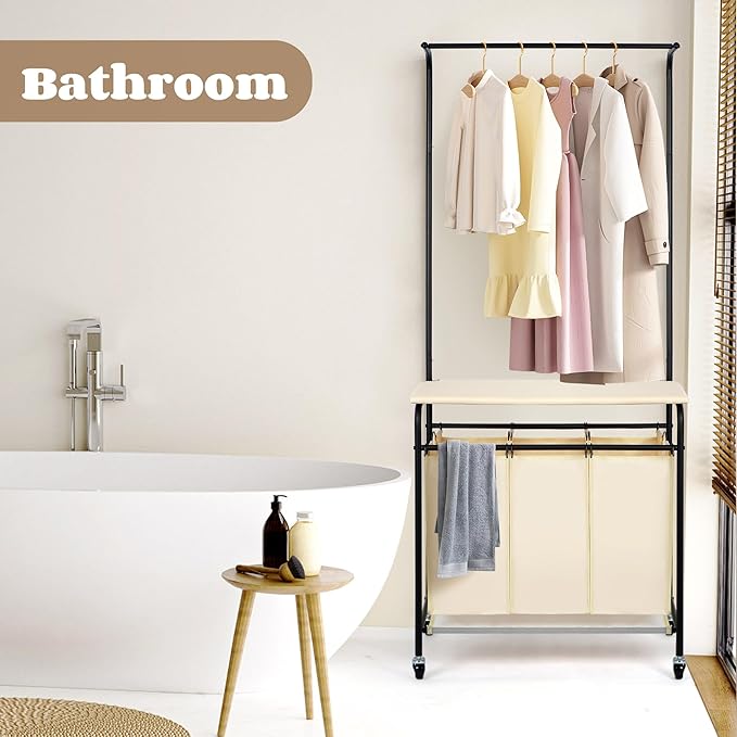 MYOYAY 3 Section Laundry Sorter with Garment Hanging Bar Rack Foldable Ironing Board, Laundry Basket Organizer Heavy Duty Laundry Hamper Rolling Cart with Lockable Wheels and 3 Removable Bags