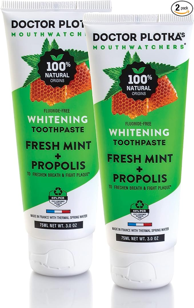 MOUTHWATCHERS Whitening Fluoride Free Naturally Sourced Toothpaste, 2 Tubes, 3 oz Each, for Sensitive Teeth and Gums, Fresh Organic Mint and Organic Propolis, by Dr. Plotka's