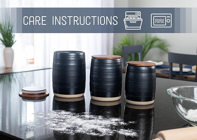 - THREE (3) PIECE SET - Includes three kitchen canisters of various sizes; Each includes a wooden lid with sealing rubber gasket around the rim