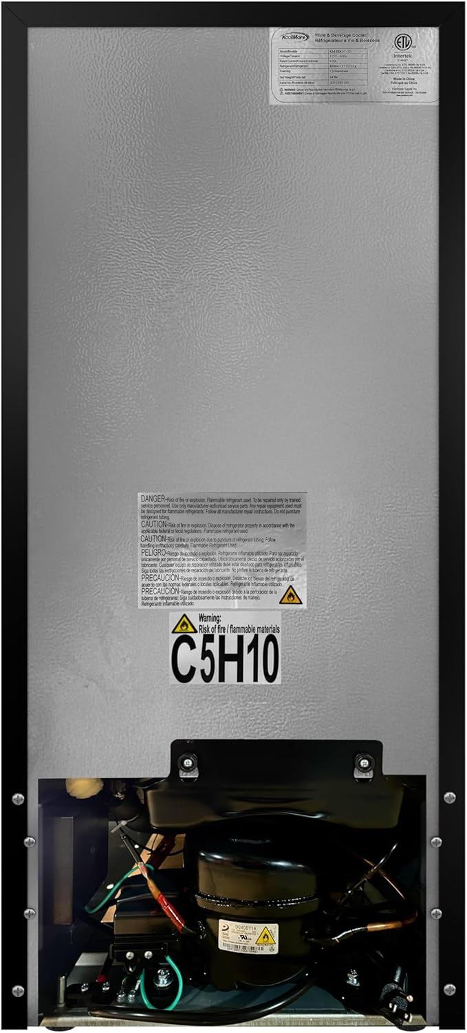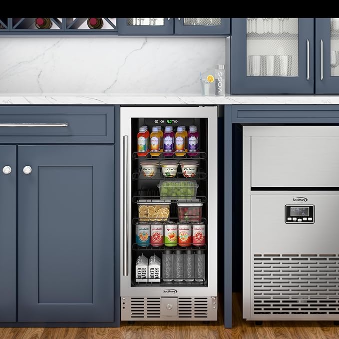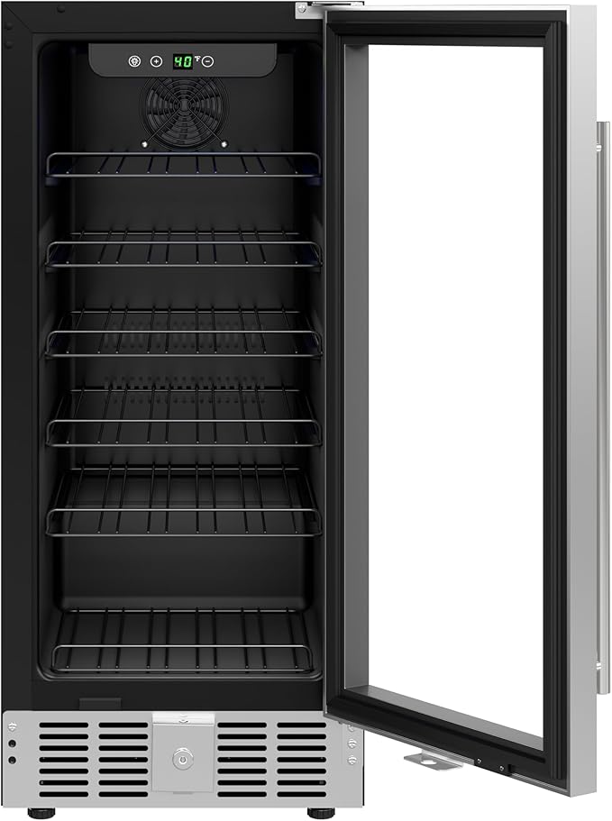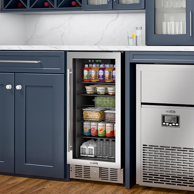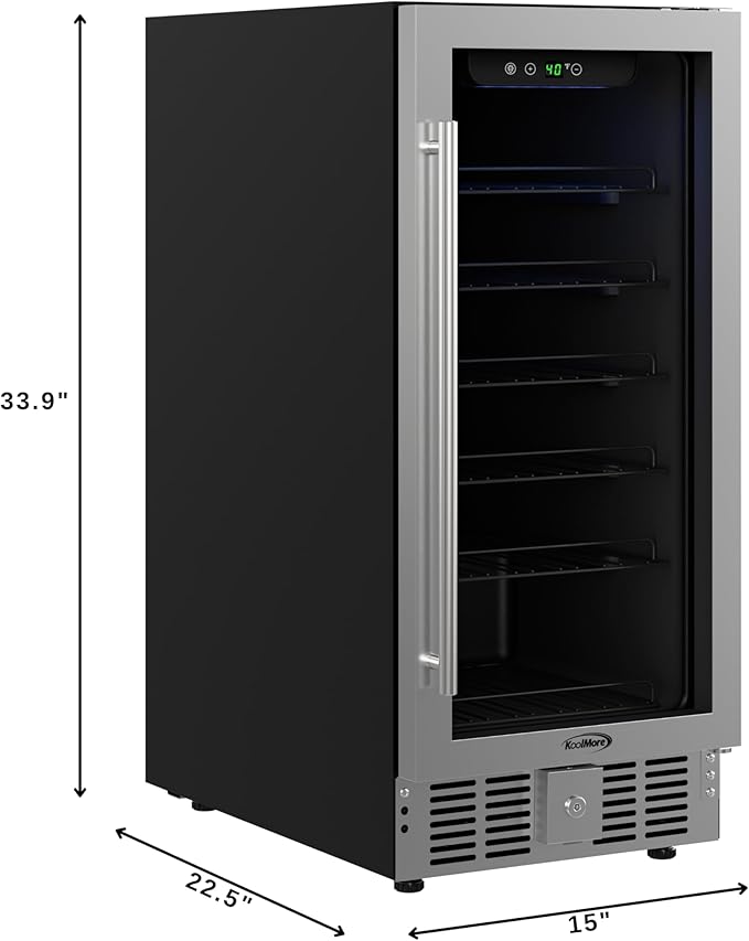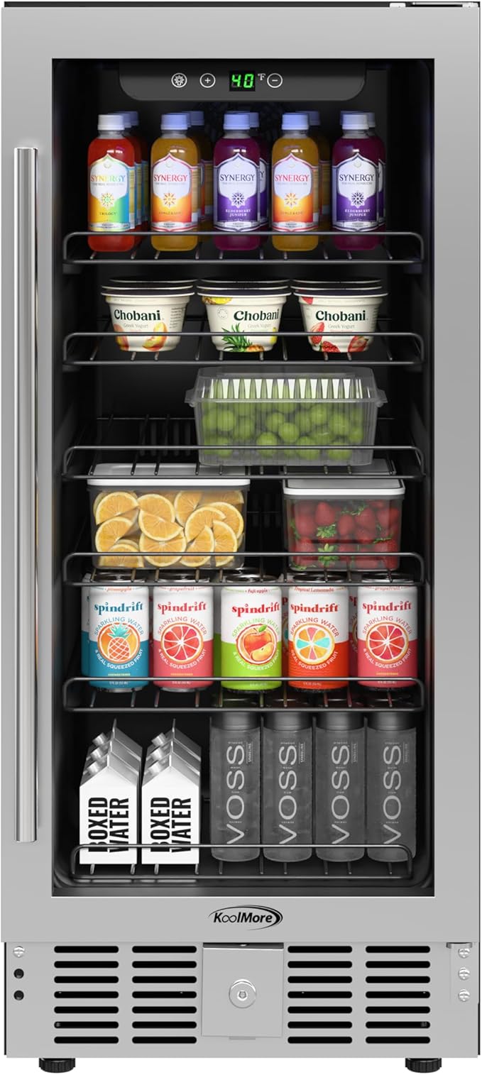 KoolMore 15” Inch Small Built-In Refrigerator and Beverage Cooler for Soda Cans, Beer Cans, Food and Fresh Snacks, 5 Wire Shelves, Adjustable Temperature Range (KM-BIR3C-GD), Stainless Steel