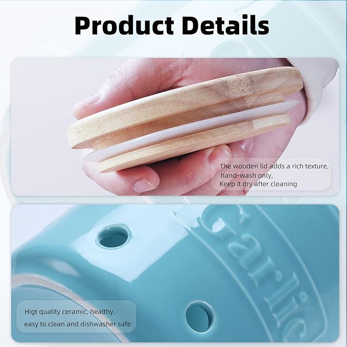 - CERAMIC MATERIAL : This Garlic Keeper is made of ceramic.The surface is smooth and translucent, which is easy to clean.It can be washed in the dishwasher