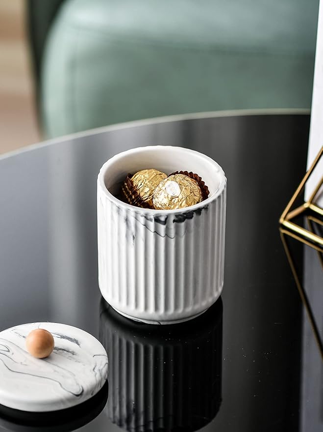 - Storage Fashion - These stylish ceramic jars and bathroom trays save space and decorate your home, stylish and organized presentation your powder room, bedrooms, bathroom,vanity organizers, shelves, entryway tablesand are also perfect for your kitchen or office,which takes very little room.