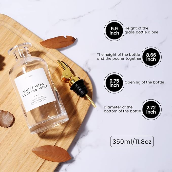 - Modern Kitchen Essential: Minimalism Inspired Cooking Oil Dispenser Bottle. This Set Includes Two High-quality 11.8 Oz (350 Ml) Glass Bottles, Two Silver Pourers, a funnel, and a 22 Label Set.