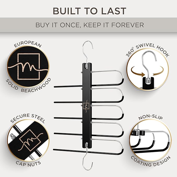 - BUILT STRONG FOR HEAVY CLOTHES - With premium quality beech wood your clothes hanger organizer is built strong to hold up to 30lbs of your heaviest clothes. For light scarf storage or heavy pants our multi functional pants holder will not not bend or break thanks to a quality crafted beech wood hanger organizers.