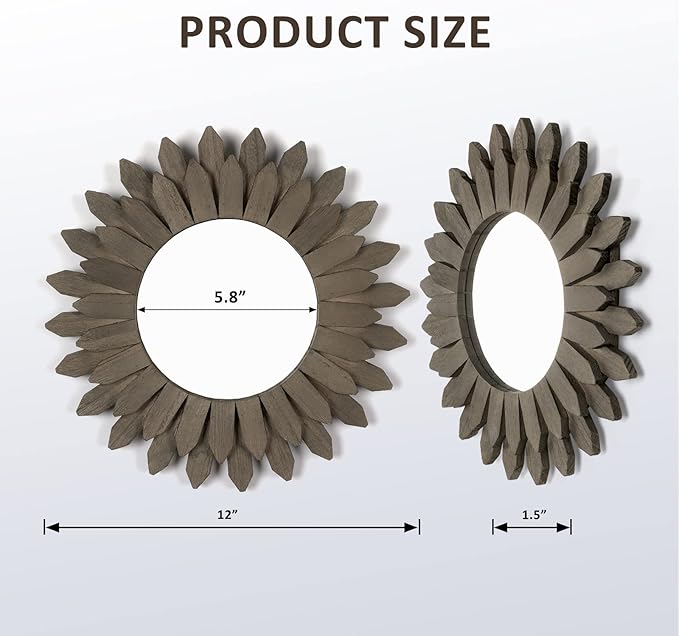 Honiway Farmhouse Wall Decor Mirror 12 inch Sunburst Boho Wood Mirror Rustic Home Decor Room Decoration for Bedroom Living Room Weathered Grey