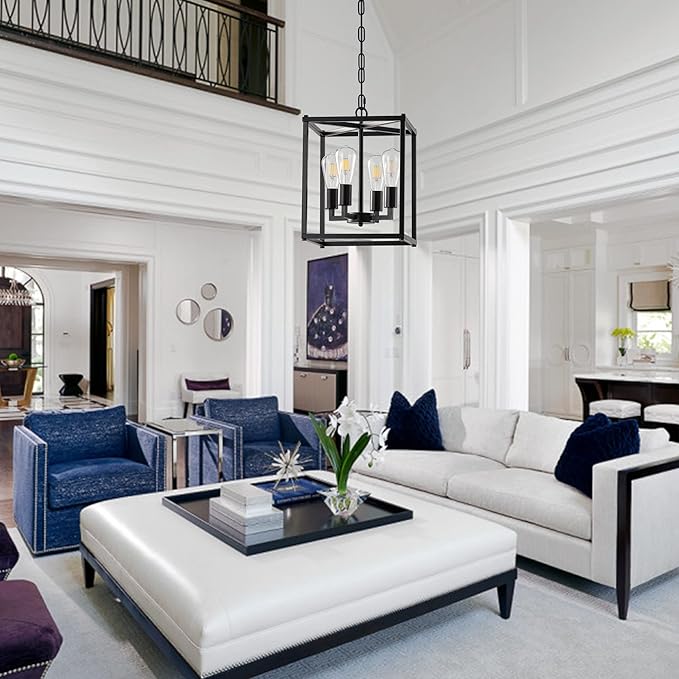 Lantern Pendant Light, 4-Light Black Chandelier,Modernized Ceiling Hanging Light Fixture for Bedroom Kitchen Island Foyer Living Room Dining Room Hallway