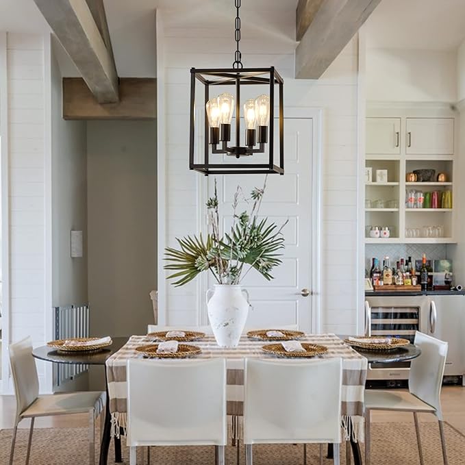 - 【Farmhouse Industrial Style】: Febeleven 4-light farmhouse chandelier adopts a cage-style retro hollow metal design. The black hardware frame and the internal brass-colored lamp cups show their individuality. They cast unique shadows when lighting, which is very delicate and warm.