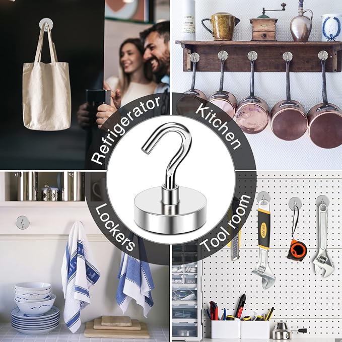 - 【Premium Magnetic Hooks】- Ni+Cu+Ni Triple Layer nickel coating greatly reinforces corrosion resistance. The best coating available, which provides a shiny and rust resistant coated steel cup provides protection for the strong metal magnetic hooks and helps to prevent chipping or cracking, Safe to Use!
