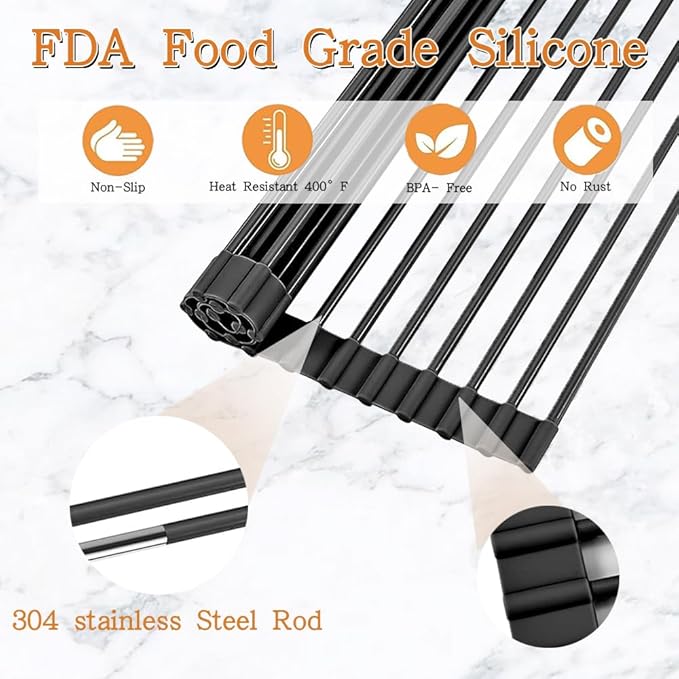 LEMIKKLE 20.5" x 13" Roll Up Dish Drying Rack Silicone Wrapped Over The Sink Dish Drying Rack Foldable Sink Drying Mat, Heat-Resistant & Anti-Rust Dish Rack for Kitchen Sink, Black