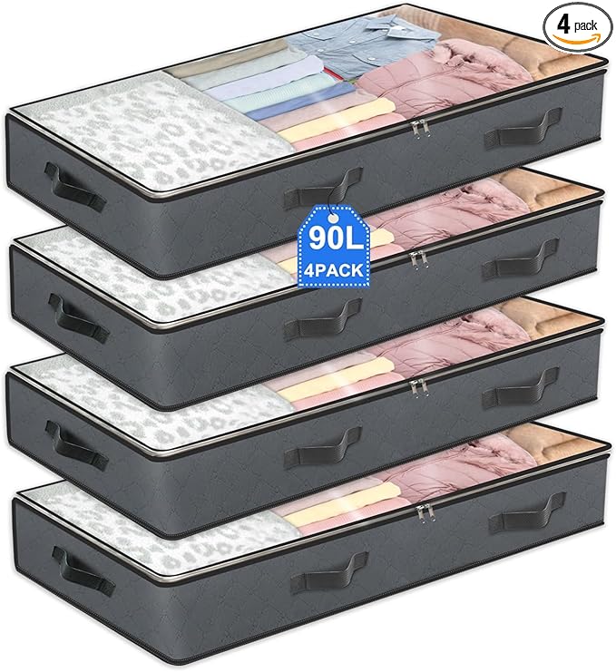 4 Pack Under Bed Storage, 90L Collapsible Closet Containers Organizers and Under Bed Storage Bins, Underbed Storage Bags for Wrapping Paper, Blanket, Towels, Clothes, Comforter, Sweaters, Linen Sheet