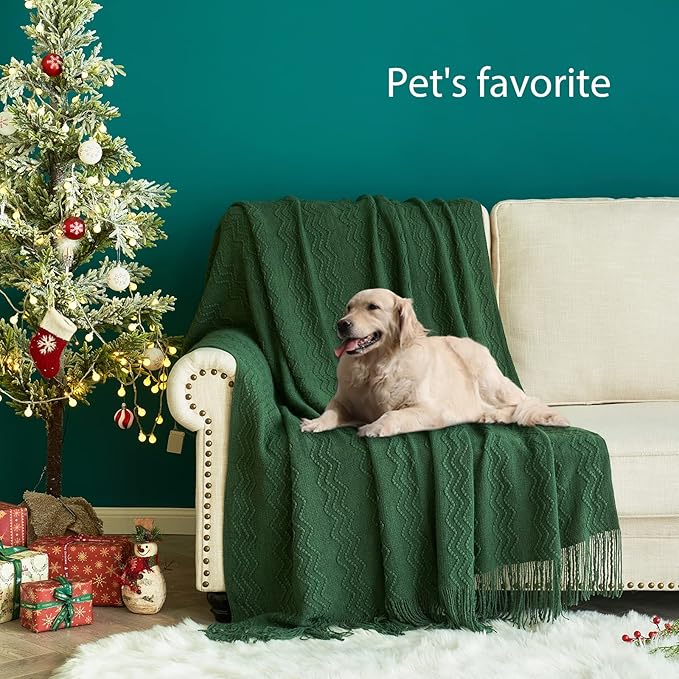 MIULEE Dark Green Knitted Throw Blanket for Couch Boho Textured Cozy Woven Blanket with Tassels for Sofa Chair Bed Living Room Acrylic Wave Pattern 50"x60"