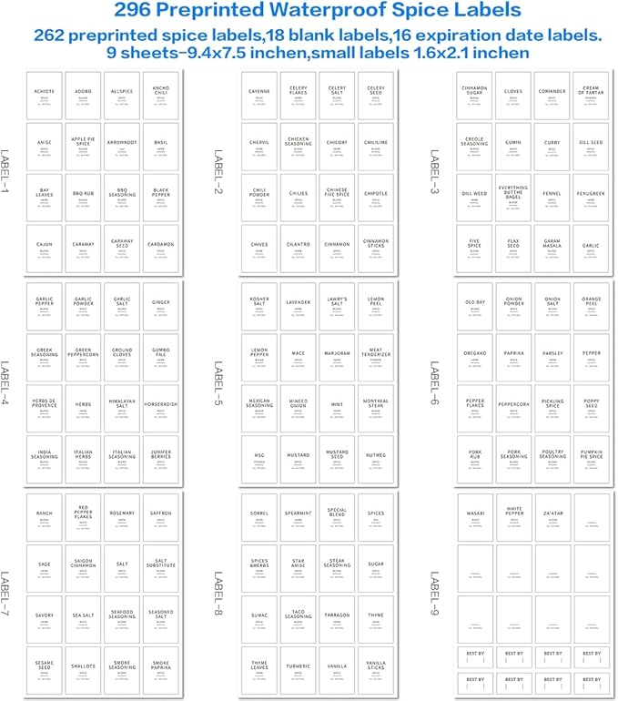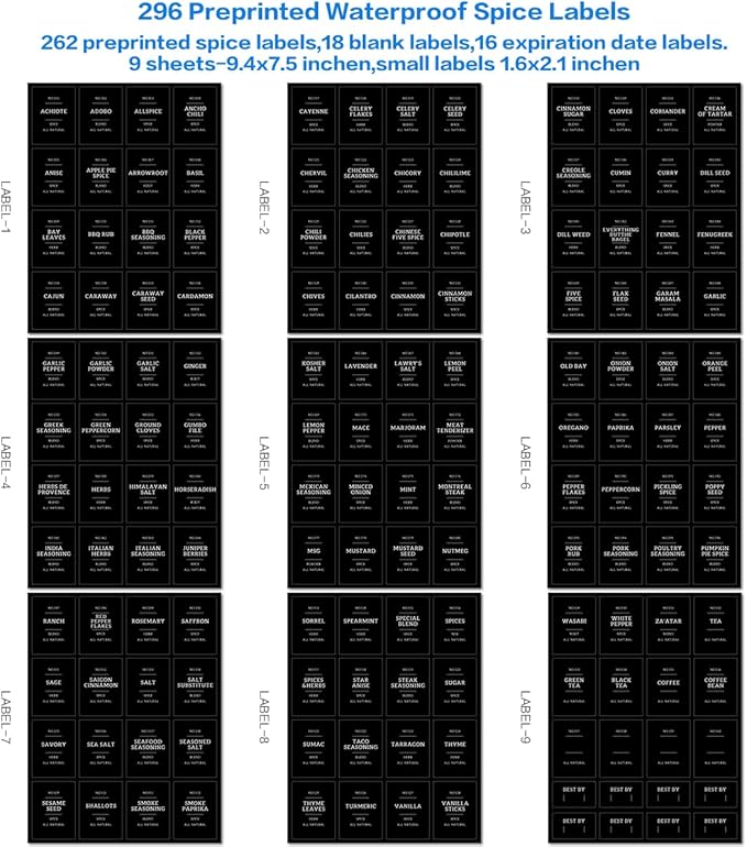 - Includes 262 preprinted and 18 blank black & white spice labels for custom labeling