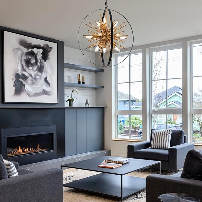- 【Stylish Design】The body of the Black and Gold Sputnik Chandelier is wrapped in a spherical shape, like a preserved firework. Every time the lights come on, it's like a small fireworks show sparking up your room. Ideal for living room, kitchen island, dining room, hallway, stairway, entryway, café & restaurant.