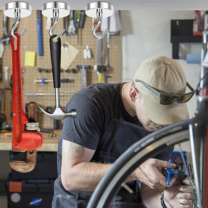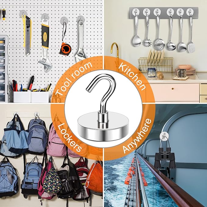 - 【Premium Magnetic Hooks】- Ni+Cu+Ni Triple Layer nickel coating greatly reinforces corrosion resistance. The best coating available, which provides a shiny and rust resistant coated steel cup provides protection for the heavy duty metal magnetic hooks and helps to prevent chipping or cracking, Safe to Use!