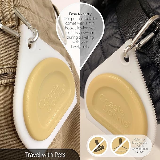 - PORTABLE AND CONVENIENT. Our innovative pet hair remover, with a sleek flat design and a robust metal hook, offers unparalleled portability. Attach it to your bag, backpack, or your pet's travel gear for hassle-free travel. Bid farewell to travel hair woes—this compact solution ensures cleanliness on the go, making it a must-have for your adventures with your furry friend!