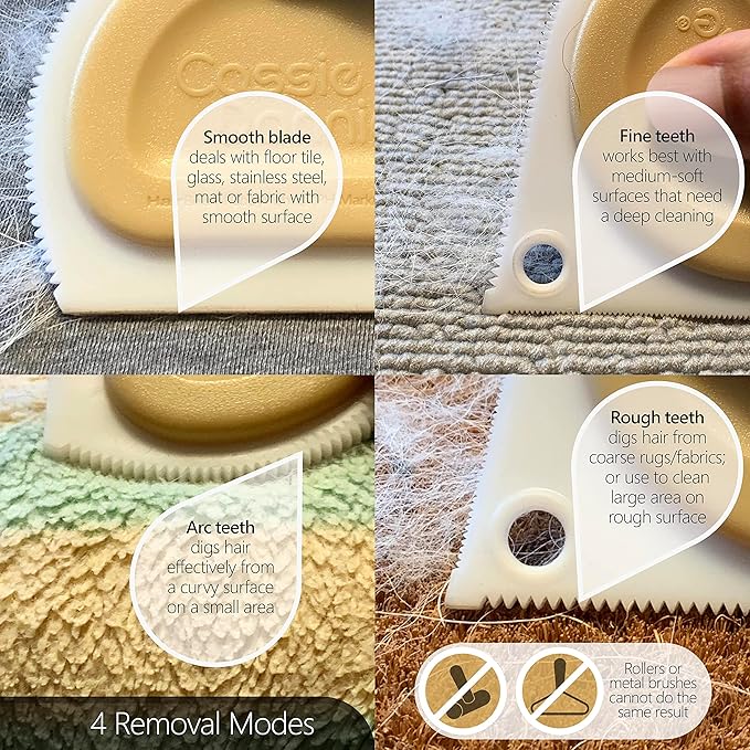 - 4 SWEEPING MODES. Our mini indoor outdoor pet hair remover has four modes for efficient cleaning. The Flat Blade suits smooth surfaces, like wooden tiles. Fine Teeth mode is ideal for medium-soft fabrics. Rough Teeth mode tackles stubborn hair on coarse rugs effectively. The Arc Teeth design extracts embedded hair from curved surfaces. It's remarkably effective, so keep a handy vacuum nearby to collect it all!