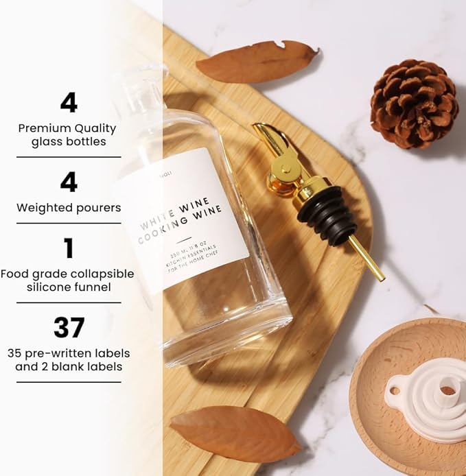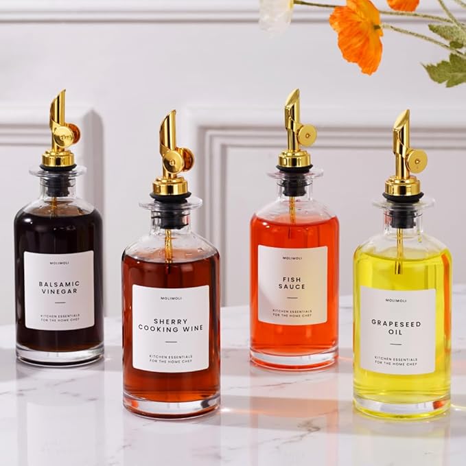 - Modern Kitchen Essential: Minimalism Inspired Cooking Oil Dispenser Bottle. This Set Includes Four High-quality 11.8 Oz (350 Ml) Glass Bottles, Four Gold Pourers, a funnel, and a 37 Label Set.