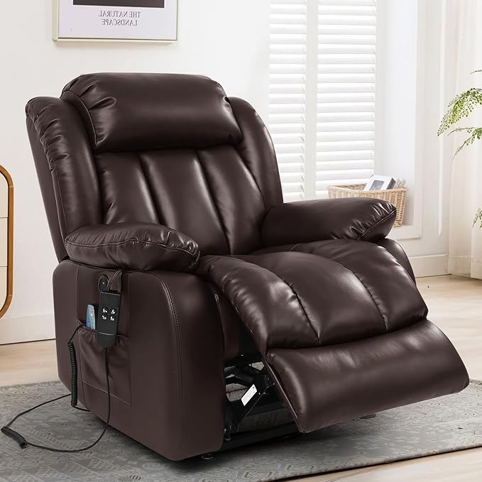 MAEVIS Power Recliner Chair, Lay Flat Sleeping Lift Chairs Recliner for Elderly with Heat and Massage,Comfy Real Breathable Leather Recliners with Dual OKIN Motor for Living Room (Brown)