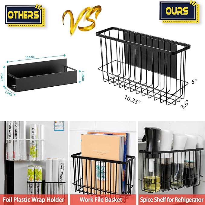 - [Magnetical Shelves for Refrigerator] Our magnetical refrigerator organizer has a large capacity with [10.25"L x 3.6"W x 6"H] inches which can hold up 4~5 bottles of sauce (16 oz), or 10~12 spice jars, also can hold up 5 rolls of plastic wrap, foil or wax wrap, as well as 5 packs of packing bags.