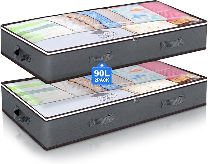 90L Under Bed Storage Containers, Underbed Toy Organizers and Clothing Storage Bags, Closet Storage Bins with Clear Window for Organizing Blanket Comforter Bedding Clothes Bedroom Dorm, 2 Pack