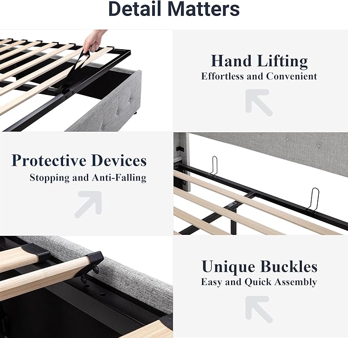 - Space-Saving Storage: With its lifting up storage feature, this bed frame provides ample space to store extra bedding, clothing, shoes, and other items, especially helpful for smaller bedrooms or apartments where storage space is limited