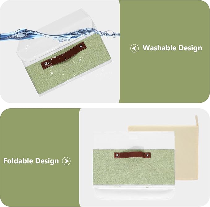 ANMINY Storage Boxes with Lids Washable Decorative Storage Bins Basket with PU Leather Handle Foldable Linen Fabric Storage Cubes Containers for Home Closet Organizer - Green White, Large Size