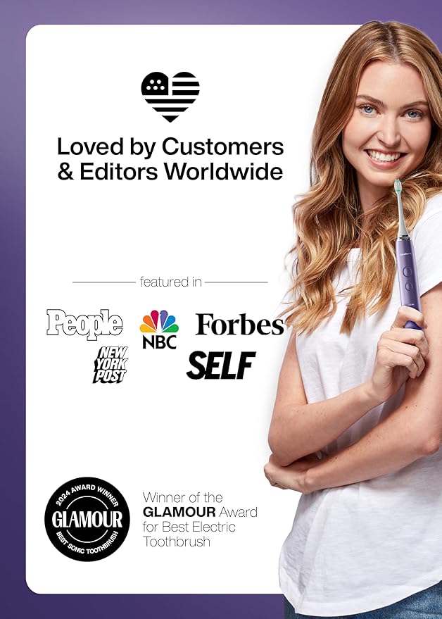 - What's in the Box – 1 Satin Violet Smart Toothbrush, 8 DuPont brush heads with protective caps to keep your brush heads clean, 1 custom travel case, user manual, warranty card.