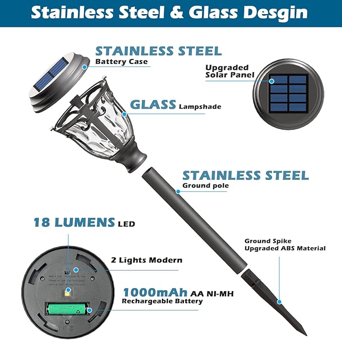 - [Stainless Steel Glass & Waterproof] LeiDrail solar lights outdoor waterproof are made of newly upgraded anti-rust and anti-corrosion coated stainless steel, which ensures a beautiful appearance and provides better sturdiness and durability, effectively extending the service life of solar lights outdoor pathway. The pathway lighst solar powered have a good waterproof system, no need to worry about rain, snow or frost.
