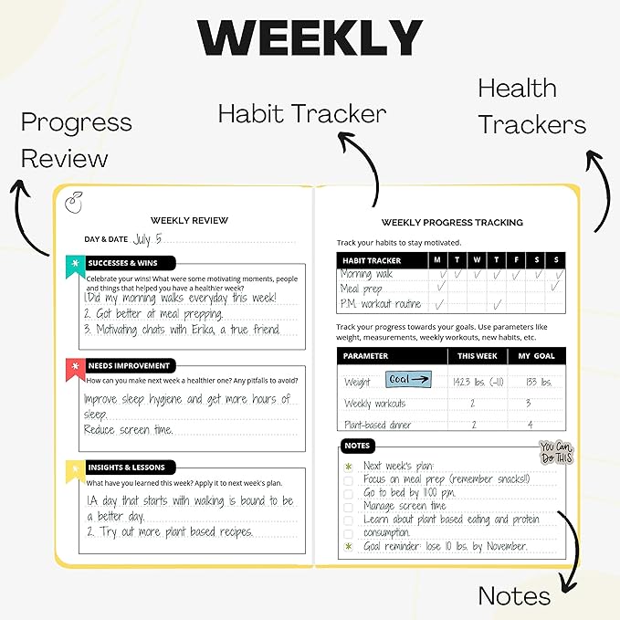 - EXTRAS & BONUSES: Inserts include habit trackers, fitness planner and wellness planner stickers. You also get exclusive access to Life and Apples Healthy Eating & Meal Planning e-package with your purchase. The package includes ebooks and downloadable planner printables such as a weekly meal planner, healthy recipes, weekly fitness planner and the complete guide to meal prep.