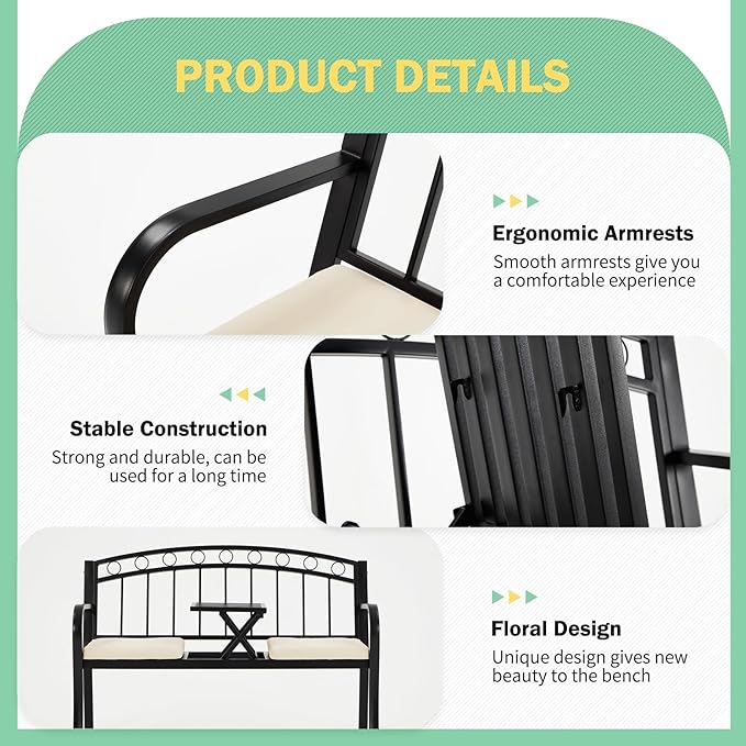 - 【Comfortable Bench】AVAWING porch bench is equipped with smooth and round armrests and soft cushions, providing a comfortable sitting experience. The metal bench allows you to relax safely. Provide you with security.