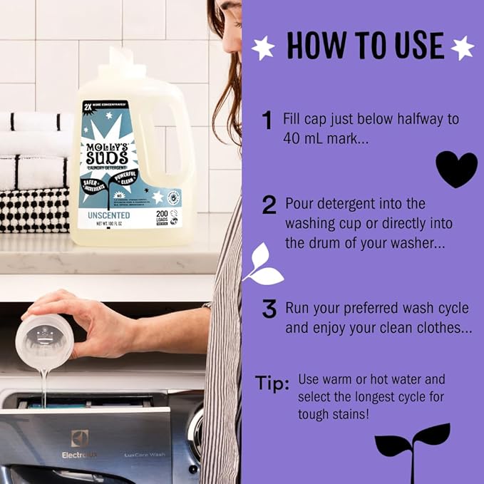 - Developed by a pediatric nurse & mom and made with simple, effective ingredients, Molly's Suds harnesses the power of plant-based surfactants and active enzymes to deeply penetrate fibers, removing soil, dirt, oil, and stains with ease.