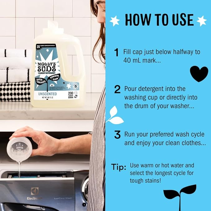 - Developed by a pediatric nurse & mom and made with simple, effective ingredients, Molly's Suds harnesses the power of plant-based surfactants and active enzymes to deeply penetrate fibers, removing soil, dirt, oil, and stains with ease.