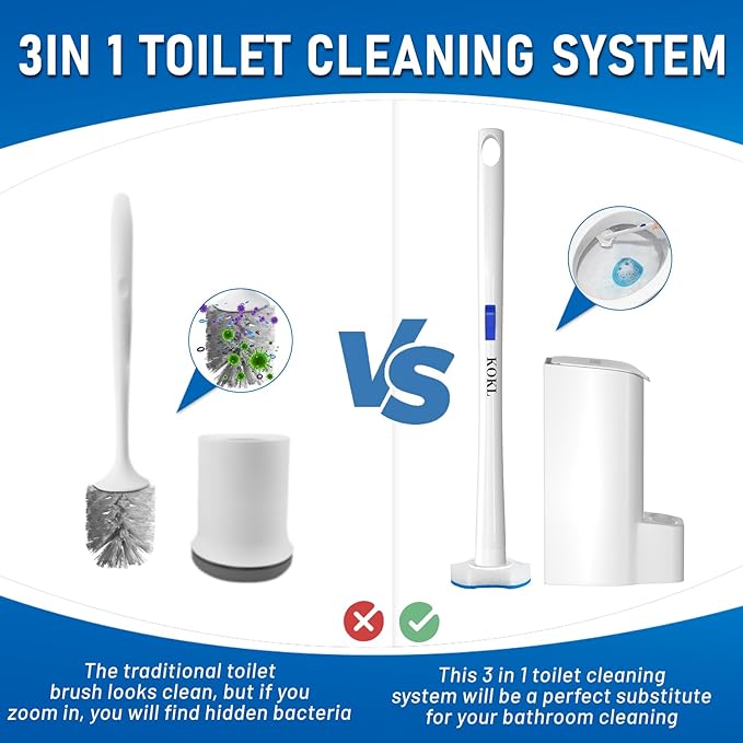 - 【SYSTEM KIT&CLEAN FREELY】This 3-in-1 toilet cleaning system kit includes 2 toilet brush handle (magic wand), 2 storage caddy and 40PCS upgraded brush refills.They will be a perfect substitute for your bathroom cleaning supplies and solve all the inconvenience of cleaning your toilet, without to carry around a bottle of toilet cleaner and dirty toilet brush.For more refills, please go to toilet refill heads under ASIN:B0CCND2G7J and B0CDM635JL.